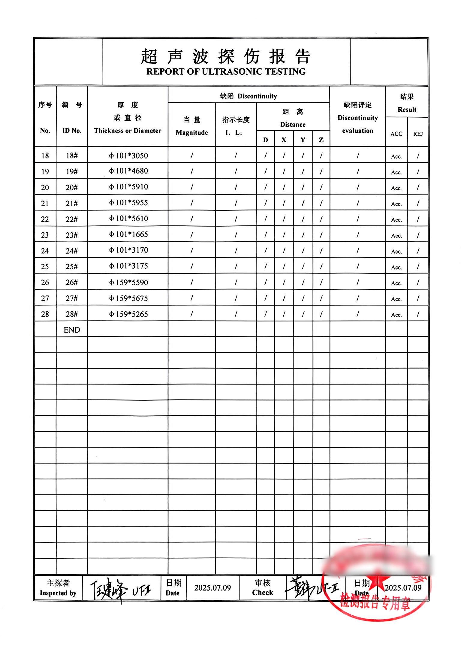 Below are sample Ultrasonic Testing Reports and Mill Test Certificates (MTC) demonstrating defect-free materials and full compliance.